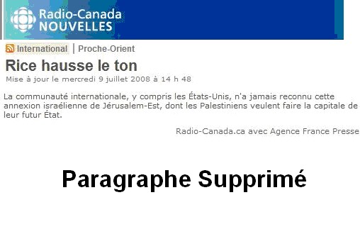 Radio-Canada publiait récemment deux articles (voir ici et ici) sur son site web indiquant de façon erronée que « Près de 20 000 Juifs vivent dans les colonies implantées dans la bande de Gaza, en Cisjordanie et à Jérusalem-Est. » Contrairement à cette déclaration, Israël a évacué plus de 8500 soldats et résidents de l’implantation juive de la bande de Gaza en 2005. Il n'y a actuellement aucun résident ou présence physique israélienne dans la bande de Gaza. HonestReporting Canada a porté ces erreurs à l'attention des rédacteurs en chef de Radio-Canada.ca qui ont supprimé le paragraphe erroné de leur rapport en ligne: (Voir notre saisie d’écran ci-dessous). Avant